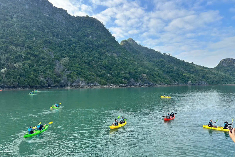 Tiếp tục hành trình trên biển tới vịnh Lan Hạ và chèo thuyền kayak khám phá các bãi tắm hoang sơ, tùng vụng của vịnh Lan Hạ với những núi đá vôi tuyệt đẹp mà thiên nhiên ban tặng.